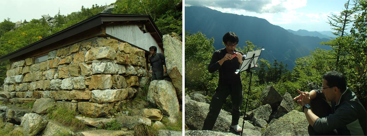 石室の中は暗いので外でくつろぎ、土方は軽量の譜面台まで持参してオカリナを吹く。その間に到着するパーティがあり、1隊は土間にツェルトを張るという。こうなると石室も窮屈なので、自分たちはテント場に移動した。夕食にしながらもオカリナは続き、周囲の人たちにも好評だった。