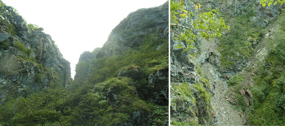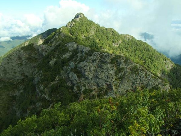 そこからはほぼ稜線上のアップダウンで中ノ川乗越に至る。擦れ違ったパーティはやはり乗越に泊まったとのこと。乗越付近のテントスペースは、まず手前に2人用程度の場所があるが落石が来そう。乗越の底には5人用が張れそうで、こちらはよほどの崩落がない限り安全そうだ。ここまでの樹林の間にも小さなテントを張るスペースはあったが、やはり石室かここかということになるだろう。
