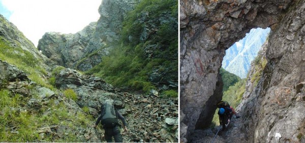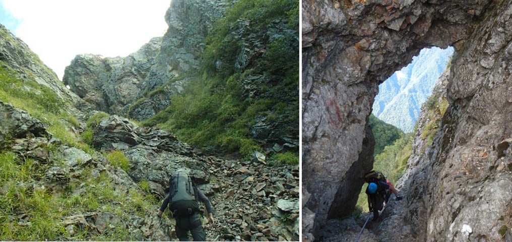 頂からわずかに戻ると南西のガラ場を示す色褪せた矢印があるが、下りてみても稜線には繋がらない。しばらく探していると後から来た人がルート概念図を見せてくれて「かなり下る、とあります」。するとこのガラ場なのかと行ってみると、樹林中を急降下する道に繋がっていた。上から見たのでは判らなかったが稜線はスッパリ断ち切れており、それが大ギャップなのだった。最終的に120mも下って大ギャップからのガレた谷を渡り、岩尾根をバンドで横断してルンゼに入る。見上げる稜線に開いている穴が鹿ノ窓だ。少し上がると長くて新しいクサリが付いているが、頼らずに登る。後続パーティがいるので脆い岩を落とさないように気を遣い、鹿ノ窓を潜って一息。ここを下る場合には懸垂下降した方が安全そうだが、一度ではロープが届かないだろう。いったん切ってクサリに支点を取り直すか?