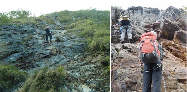 推測通り稜線からの急傾斜にクサリが下がっており、向かい側もまたクサリ付きの岩壁。これが小ギャップだ。途中まで下ってからクサリに合流する踏み跡を辿ったが、いちばん下まで行くと最後でヒヤヒヤするので、一段上でクサリを掴んだ方がよい。下りていると、矢田の目の前から子供の頭ほどの落石が発生。「ラク!」と声を上げ、下にいたパーティに避けてもらった。登りは逆層気味の岩だが、クサリの左側に適当なホールド、スタンスがあって自力で登れる(最後だけ安直にクサリを掴んだが)。