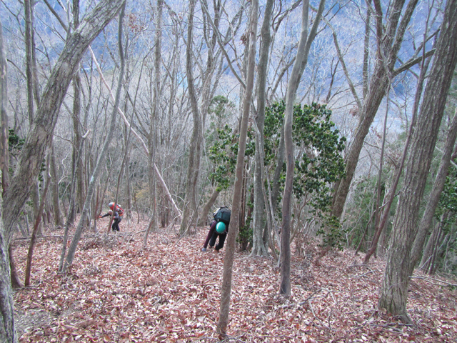 登山の目印の少ないルートで、1220mで初めて赤テープを見る。戸屋地区からのルートとの合流を示すものだろう。ここまでは伐採された杉に薄いながらも藪が被ってルートが見えにくかったが、スッキリと落葉した樹林となって歩きやすくなる。赤テープが増えたのは、ランカン尾根は戸屋地区側から登るのがメインということか。