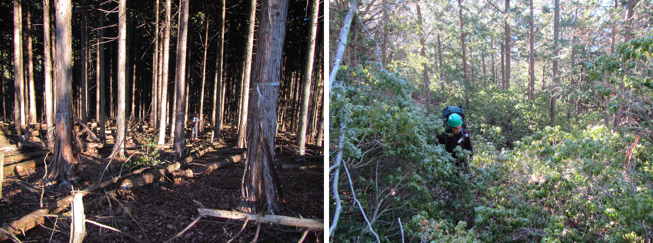 広葉樹林帯を落葉を踏みながら900mジャンクションまで登り、広い尾根の針葉樹林帯手前で休憩。静けさの中にキツツキの音、サルの声を聞く。ここから進路は北に向いていく。植林帯に入ると多数の杉が切ったままに放置され、ひどく歩きにくい。ネットで読んだ記録に「モチベーションが下がるエリア」と解説されていた通りだ。木々を跨ぎ、くぐりながら登っていくと傾斜は緩むが、次はお馴染みシャクナゲの藪漕ぎ帯になった。藪を突破し、1125地点で休憩。