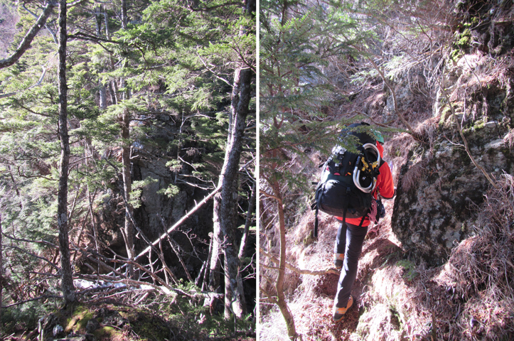 この前後は緩やかな傾斜で、p1948の手前には泊まって焚火した跡もあった。事前調査でルート中最大の核心部と考えた大ギャップはp1828.4とp1948の間のはずだが、鞍部を越えてもそれらしいところはなかった。もしかして気づかぬうちに迂回ルートを取ったのか・・・と安心しかけたのも束の間、p1948を前にしてそれは唐突に現れた。足元から急斜面で落ちるギャップを隔てて岩壁が立ち上がっている。ギャップの最低部までクライムダウンし、倒木をくぐって岩壁の基部に至る。雪が着いていればこの時点でロープを出しているところだ。基部から観察すると、岩の左側面のバンドを辿ってから折り返して木を掴めば上に抜けられそうだが、冬装備の重荷に振られれば転落しかねない。バンドを慎重に上がってみると、向きを変える箇所でホールドに乏しく足を置く場所が決まらない。ここは空中に伸びている木の幹を踏んで乗り切るきわどいクライミングで、どうやら岩の上に出られた。p1948で一息入れる。