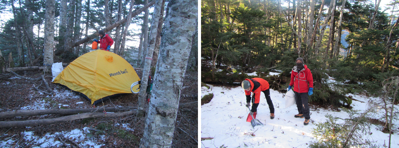 次の小ピークに登る1950m付近でようやく谷間の日陰に雪を認めるが、尾根上で白いのはせいぜいが溶け残った霜程度。この登りもまた急で、雪山装備を担いで登るのは一体何の修行か・・・ 小ピークで再度休憩し、ようやく本日の幕営予定地p2125に到着したのは15時過ぎだった。さすがにこの高度になると、日陰の地面に薄く取り残されたような雪が見られた。テントを張った近くの窪地から枯葉だらけの雪を集める。いったん凍っているため意外と多くの水を作れて助かった。