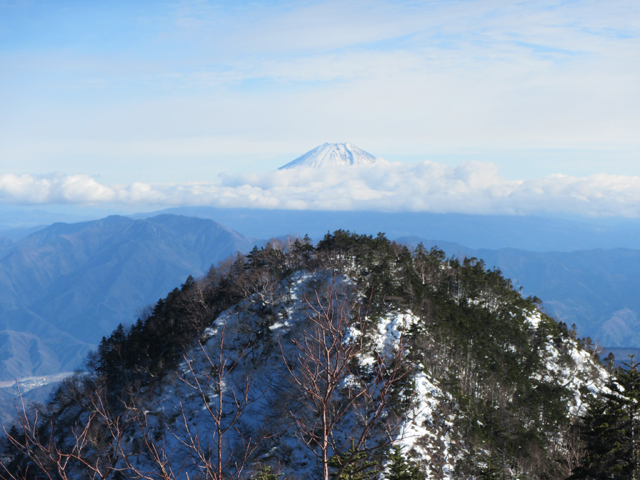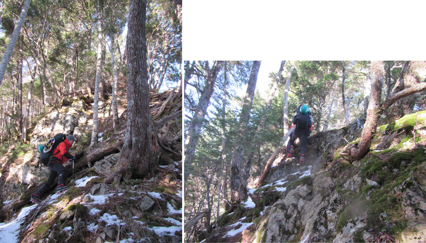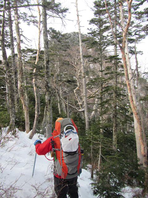 ここからの登りには岩場も出てくる。雪は薄くまだらに着いている程度で立ち木も掴めるので技術的な困難はないが、なにしろ荷が重いので息が切れる。