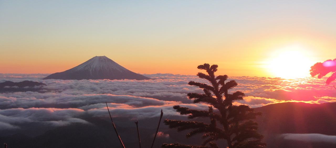 4時起床予定が何故か誰もアラームに気づかず20分寝坊し、6:30に出発。気温-13℃。できることなら布引山頂で日の出をと急いだが、樹林越しの初日の出となった。そこからもう少し登った山頂手前の2570m地点で眺望が開け、富士山と並ぶ朝日を拝むことができた。
