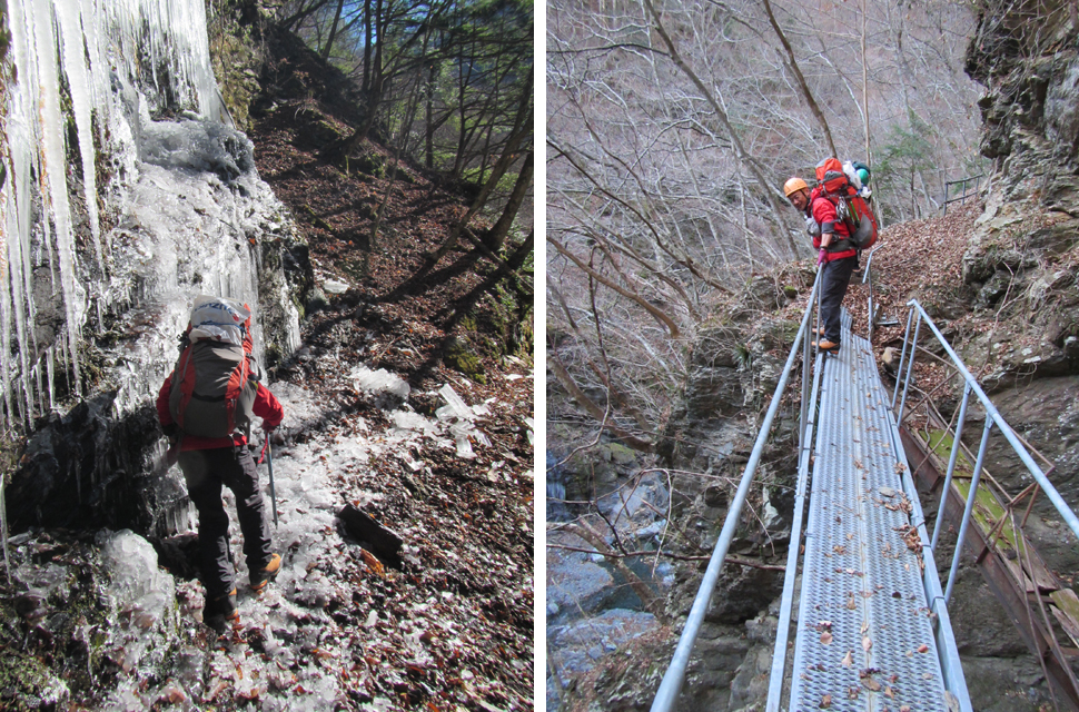 登山道は広河原で沢を横切るが、水量が多くテープの付いた箇所は靴を濡らさずには渡れない。少し下流で石伝いに行ける箇所を見つけて道に戻る。そこからは沢沿いに、場所によっては下の廊下のように切り立ったトラバース道が続く。全ルートを通して、実はここが核心だった。岩壁から滴る水が凍って多数の氷柱が頭上に下がり、しかも岩壁に日があたってその氷柱がキラキラと光りながら道に降り積もる様子が見える。景色としては美しいが大きな氷柱の直撃を受けたらどうなることか。それが一箇所ではなく、岩壁沿いの狭い凍った道の下は崖、足を滑らせたらリカバリの手段がない一歩を先頭で踏み出すのは、アイゼンを着け直しても非常に怖かった。その他、トラバース道が急峻な沢を横断している箇所に架かった橋の多くが落石で破壊されている。代替のハシゴが設置してあればましで、それ以外は橋の片側の枠を伝ったり、橋の下のザレた斜面を慎重に通過したり。高巻き用に橋の上の岩斜面に固定ロープを張った箇所もあったが、ロープが古くてささくれている上に岩も脆く、ホールドを探ったらかなり大きな塊が落ちた。這う這うの態とはこのことで、吊橋(これは一人ずつ普通に通行できた)を渡って廃屋を通過し、林道に出たときは本当に安堵した。