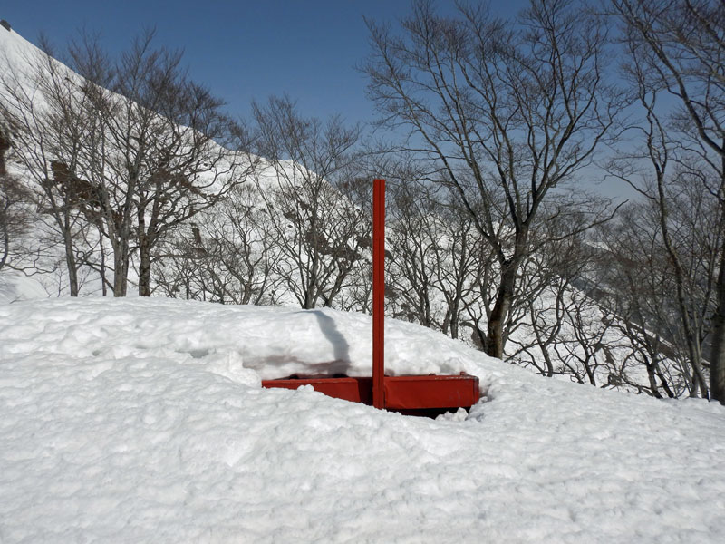 その危険個所を無事に通過して少し行くと熊穴沢避難小屋、積雪状況は写真のとおり。