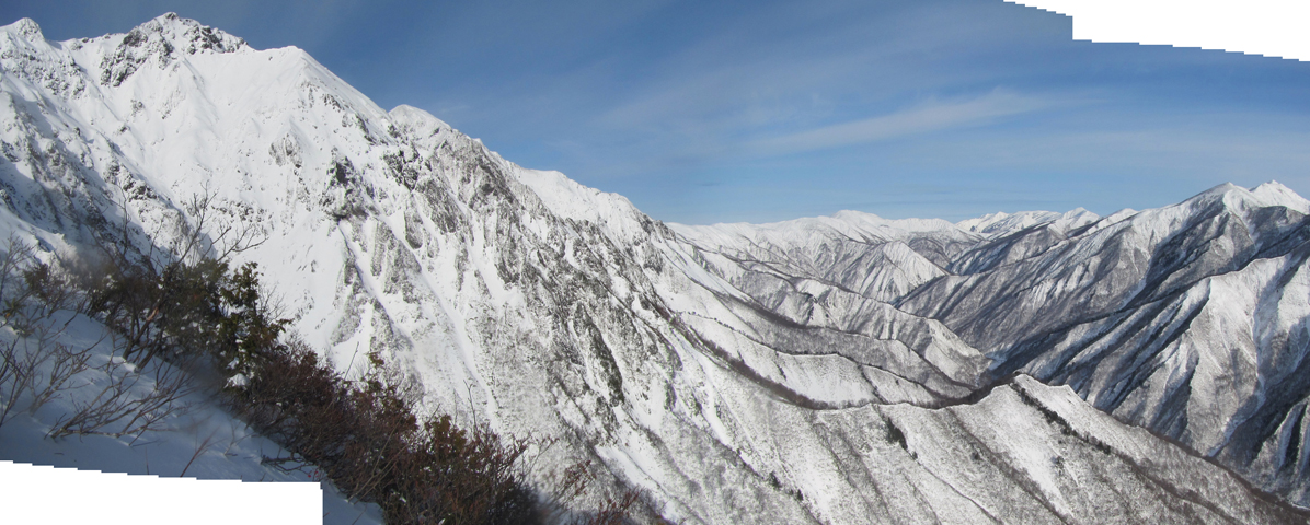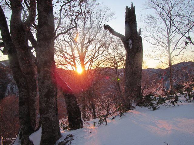 6:20、尾根入口(標高800m)から登り始め。積雪は数十センチというところだろうが、しっかりトレースが付いており歩きやすい。すぐ上にいた大人数のパーティはラッセル訓練とのこと。7時、1000mを越えた辺りで日の出となった。木の間越しに見える峰がモルゲンロートに染まり、振り返ると白毛門も美しい。気温は-7℃だが、無風快晴で暖かく感じる。
