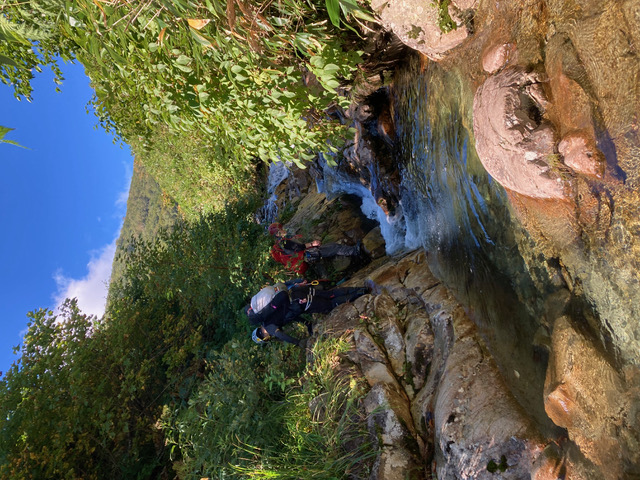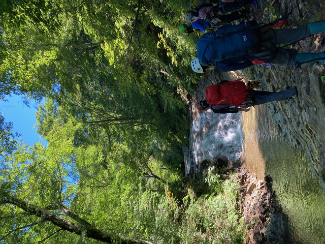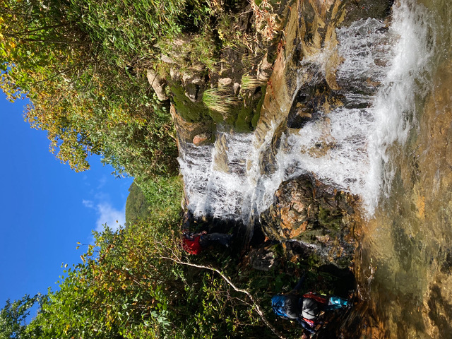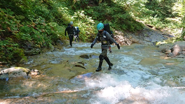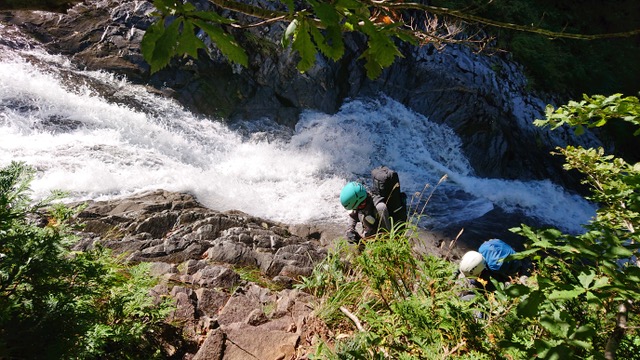 4時半起床。気温は高めの予報だったが、明け方は冷えた。昨晩の火をおこし、朝食を済ませて6時半に出発。今日は、昨日より水量が減ってラクなはず、だったが、釜、くの字滝など水量が多く、ロープを出して高巻いたり、懸垂下降したり。