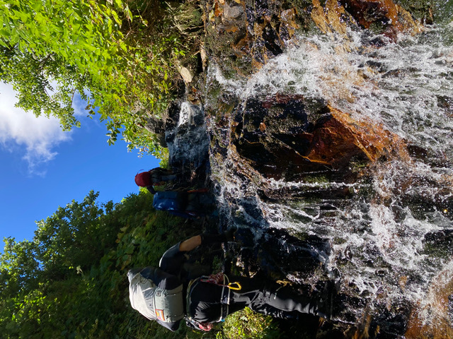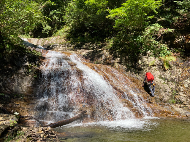 ゴルジュは高まき、7m滝はロープを出して右から登る。小ぶりな滝やナメが多く、気持ちが良い。