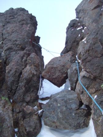7:45 1ピッチ目 登攀開始(浦野リード)。Ⅳ-。チョックストーンが少し嫌らしいが,残置スリングにA0して突破。岩を抱きかかえるようにして,強引に攀じ登る。しばし進んだ後,右上し(この右曲がりで多少ザイルの流れが悪くなる),少し左に回り込んだところの垂壁でピッチを切る。立派なペツルボルトと残置スリング(しっかりしている)有り。