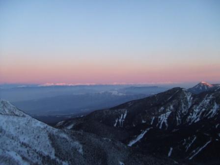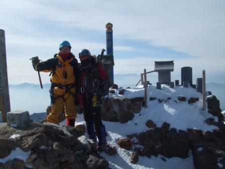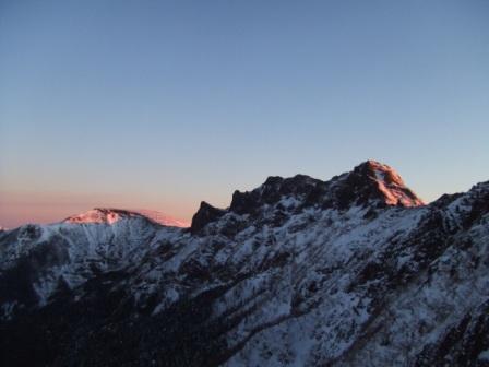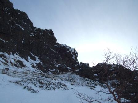 5ピッチ目(浦野リード)。雪壁をアイゼンの前爪を効かせて登攀するが,(斜度が急になってからは)中間支点を取るところがなく,かなり嫌らしい。自分の中では,このピッチが核心であった。結局,気合いで踏ん張り,雪面から少し出た強固な灌木を支点にしてピッチを切った。前爪を効かせようにも,岩に薄く氷が張り付いてたり,雪が少し柔らかくバイルが効きにくい等,泣きそうだった。後ろから来た男性2人組のトップの方は,一気にリッジまで抜けていた。途中,会話をし心を落ち着かせる。