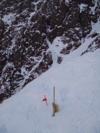 4:45起床。テントの外はまだ真っ暗。星がきれいだ。5:55ヘッデンをつけて出発。隣のテントの4人組は既に出発している(ちなみに主稜狙い,とのこと)。6:45,文三郎道から取り付きへのトラバース地点に到着。目印は,蛍光ピンクの吹き流し(割と小さい)が竹竿の先端にくくりつけてある。先行パーティー(4人組)が取り付きで準備をしているため,しばし,トラバース地点で待機。1月に天候不良で引き返した時はマイナス18℃だったが今回はマイナス6℃。風も余り無くコンディションとしては申し分ないと言える。 先行パーティー(2人+2人)の先行組(のフォロー)が登り始めたため,トラバース開始。事前にネットで読んでいたとおり,部分的に結構嫌らしいが,慎重にトラバース。取り付き点に付き,登攀準備にかかる。