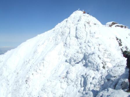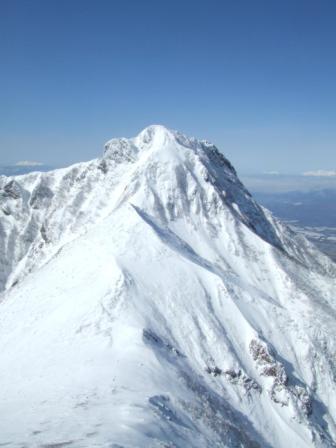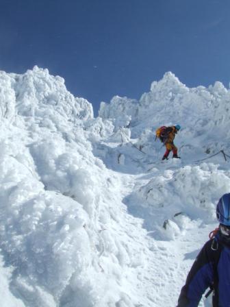 二人が登ってくる間に先行していた飯干さんのトレースをたどって合流。続く小岩峰も結構いやらしくロープを出し浦野リードで登る。11:00すぎに大天狗基部取り付きに出る。立ち木に支点をとり、松井リードで残置ハーケン2箇所(1つには青の残地スリングあり)にランニングビレイをとり、上のバンドに上がろうとしたが、ほとんど空身だった秋とは勝手が違い、なかなか上がれない。アイゼンのスタンスをきめ、やっと上がったと思った瞬間に上体が突如後ろへ引っ張られたようにフォール。幸い落ちた場所は潅木の上に積雪があり、クッションの上に落ちたような感覚だったが、見ていたメンバー3人にはかなりショックだったようだ。一応どこにもケガをしていないことを確かめてから取り付きに戻る。メンバーから空身で登ろうという意見が出、松井が再度いくことも考えたが、ここまでの行程で消耗していたこともあり二見さんに交代する。2箇所のランニングビレイはしっかりしていたのでトップロープ状態で進みバンドもクリア。飯干、松井、浦野の順に登り、最後に二見さんのザックを引き上げる。