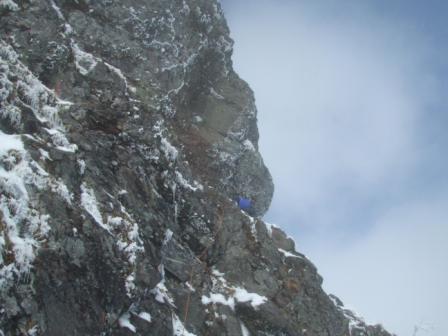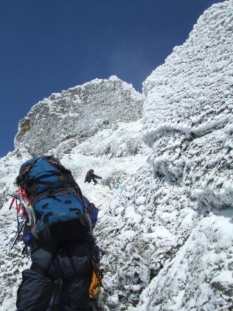 4:00 起床。曇天。各自で朝食後テントを撤収しアイゼン・ハーネス・ギア類・ヘルメットを装着して6:00出発。30分程上がったところで前方にカニのツメが見える。10mの壁はそのまま登り、30mの壁でロープを出し松井リード開始(7:40)。雪から掘り出したFIXロープの周りにはびっしりと氷がついていて、プルジックをすべらせるためにピッケルで氷をたたき落としながら少しずつトラヴァース。FIXロープ終了地点からのルンゼは雪がしまっていて立ち木にアンカーをとりながら順調に登るがビレイ解除まで45分程かかった。飯干、二見の順にプルジックで登攀し、浦野さんは引き上げる。9:40全員が通過。