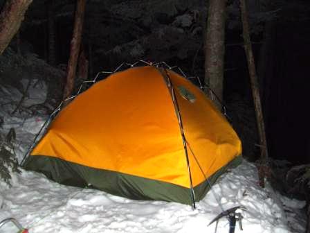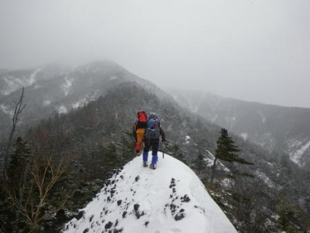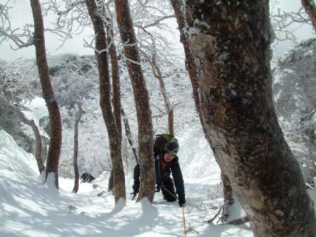10:50 秋の講習で取り付いた地点から天狗尾根稜線を目指す。トレースは全くなく、深々ともぐる雪と倒木、笹や石楠花の潅木にエネルギーを消耗しながら、ラッセルを交代しつつ高度を上げ1時間余、やせ尾根に出たところでワカンをはずしアイゼンをつける。講習時に歩いた下の道は雪で埋まっているので、風の合間を計りながらリッジを慎重に進むが、最後の2、3歩の下降にかなり緊張する。再び樹林帯の中に入り、ラッセル。しばらくしてテントを張るのに充分な広さの平坦地に出る(2150m)。地形図上で一日目の最低限の目標としていた地点だが、時間が早いので先へ進む。途中2250m付近にも充分なスペースがあったが、もう少し上がってみようと最後の一頑張り。15:30 テント一張り(200×210:メスナー)がギリギリのスペースを見つけ、幕営(2350m)。ちなみに携帯の電波はアンテナ3本が立った。