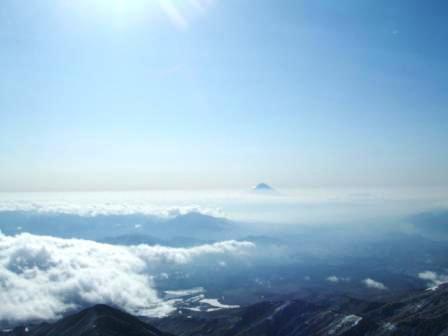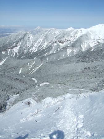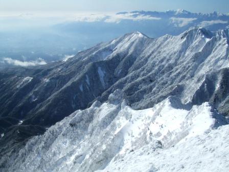 ふと気づくとテント越しに周囲が明るくなってきている。風は相変わらずだが首を出して外を窺うと快晴。360°の視界が本当に嬉しい。ゴチャゴチャになっているテント内の荷物を少しずつ片付け身支度を調える。不安定な場所なのでお互いにザックやテントを確保し合いながら外へ出、テントをたたもうとするが、凍りついたテントは一抱えもある重い塊りにしかならず、これを浦野さんが苦労の末ザックにくくりつけ出発(7:30)。足元のアイスバーンや強風に肝を冷やしながら 9:00すぎに真教寺尾根との合流点に達し天狗尾根を振り返るともう大天狗を越えてきているパーティの姿が見える。更に赤岳、阿弥陀岳山頂の人影や文三郎尾根を登ってくる登山者を見て、なぜか少しホッとする。