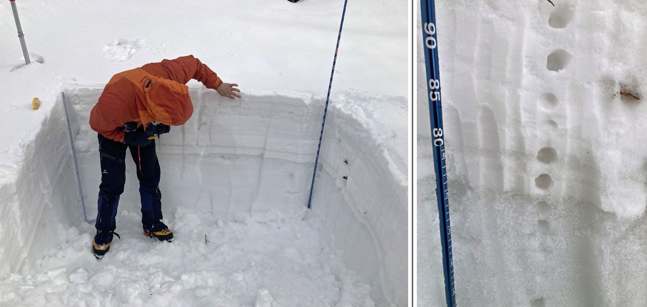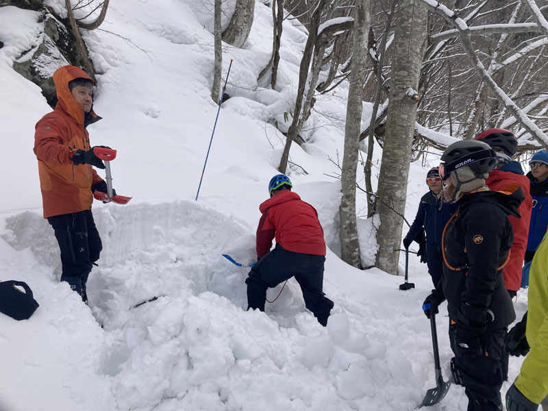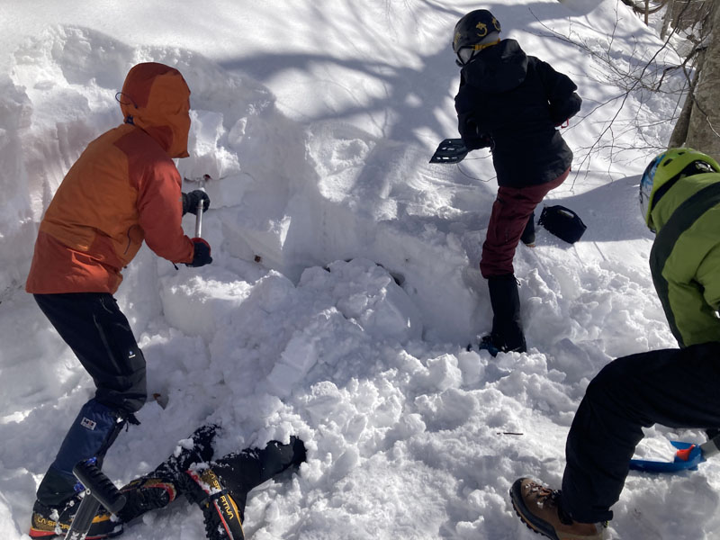 はじめに雪崩地形や雪崩の種類について。その後斜面沿いの雪を掘り、断面観察を行った。上から順に指を刺していくと、見た目では気づかないところにも弱層が存在することが分かった。