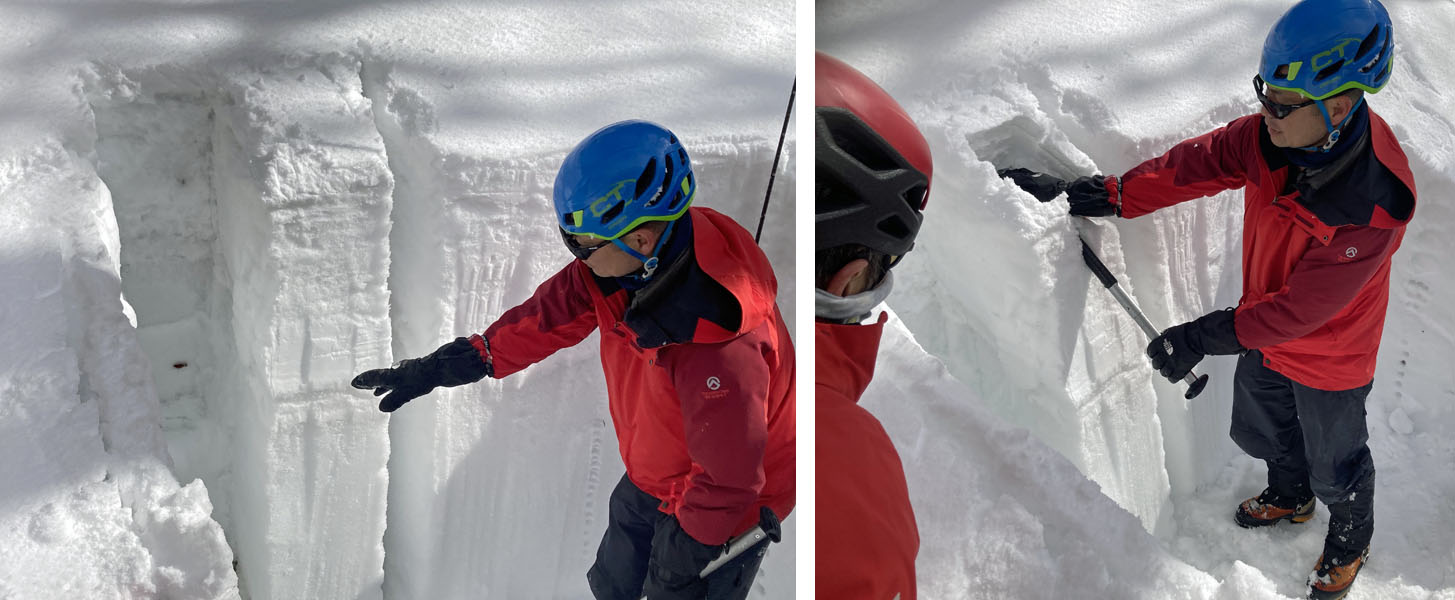 コンプレッションテスト。スノーソーで綺麗に雪柱を切り出し、スコップの上から手首・腕・肩を起点に叩くことで弱層を見つける。なかなか手が痛い。