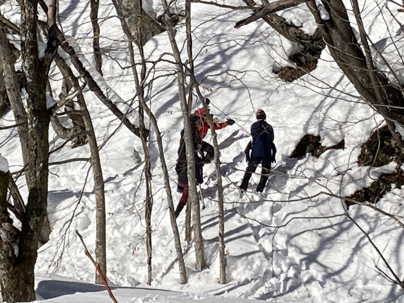 他にも複数グループが訓練を行っており、我々は湯檜曽川の方へ移動して実習を開始した。なお、研究生の先輩3名は、前週に日本山岳・スポーツクライミング協会(JMSCA)主催の積雪期山岳レスキュー講習会に参加しており、そこで得られた知見を踏まえて終日色々と教えてくださった。