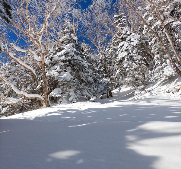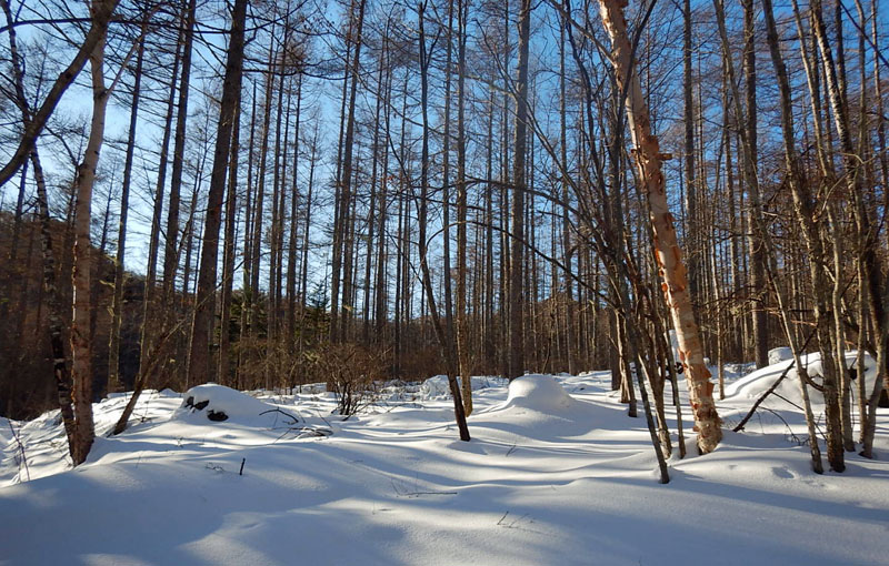 積雪は20~50cm程度。例年よりもだいぶ多いように感じる。樹幹越に日差しがあたり美しい。