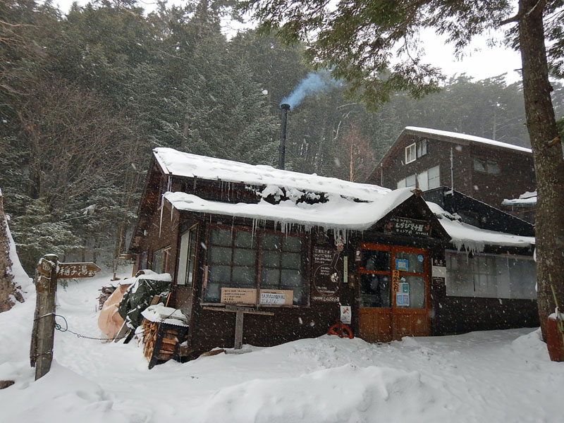 写真を撮ってすぐに下山方向のケルンを確認。コンパスのホイールをケルンに合わせて下山開始。視界は悪くなるばかりで自分の足下も見えにくい。時折立ち止まり足下をよく確認しながら降りていく。爆裂火口付近の登山コースには緑ロープがよく整備されており、誤って火口側の雪庇に接近するようなことはなかった。樹林帯付近まで下りてきた頃には風も弱くなり、行動しやすくなったが、時折ルートを見失い、股下までのラッセルになることも。そうこうしているうちに夏沢峠に到着。本沢温泉に向かい足を進める。本沢温泉の石楠花の湯は今年は営業しているようだった(2021年に通過した際は休業だったと記憶している)。日帰り入浴したいところではあるが、行動食を摂ってすぐに出発。やはり行動食を摂るタイミングや量が少ないのかだいぶ疲労している。長い平坦なルートを歩きミドリ池に到着。昨日、しらびその小屋番さんは下山した様子だったが、本日は煙突から煙が出ておりなんだか暖かさを感じてしまう。
