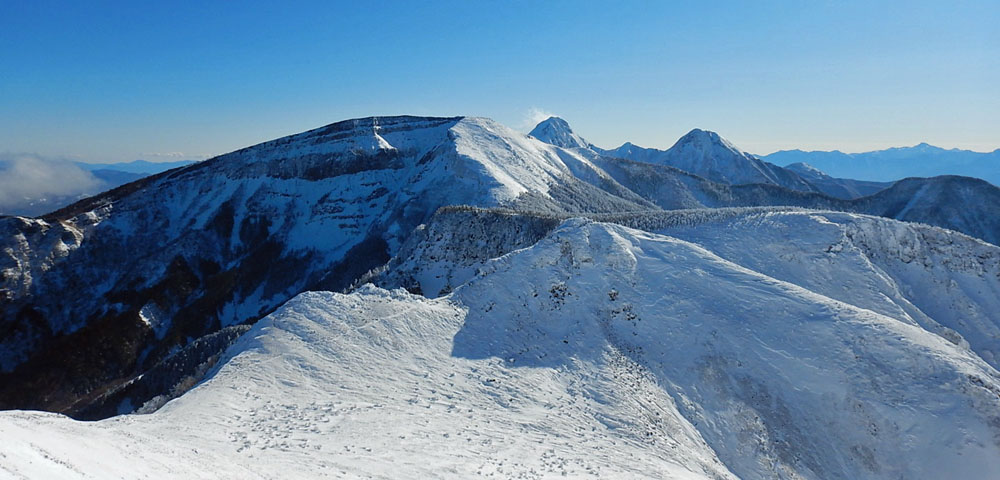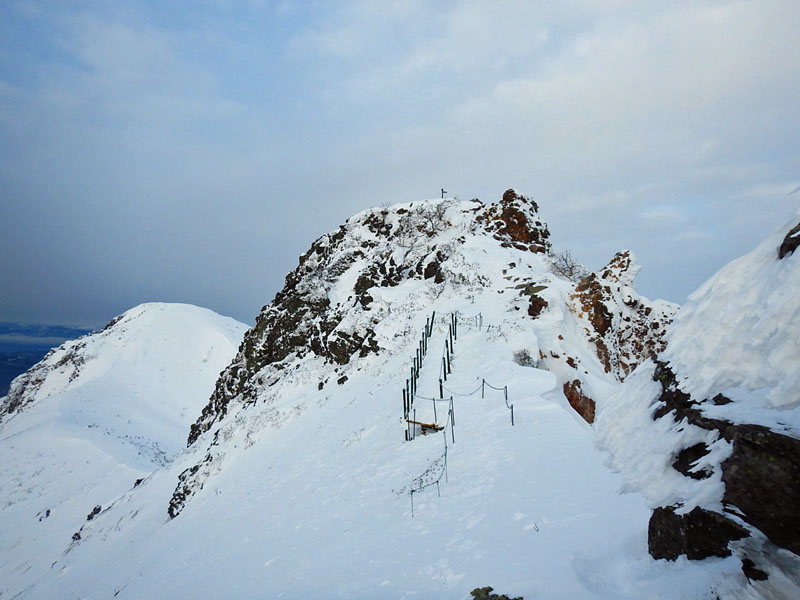 中山峠を越えてから風にさらされた。しかし、耐風姿勢をとる程ではなく許容範囲だ。足に疲労を感じるようになったが、遠方に姿を見せる北アルプスの峰々に励まされながら足を止めずに頑張る。山頂付近は例年だと浮石だらけでアイゼン歩行しにくいエリアだが、雪の下となっており歩きやすい。山頂で写真を撮影し黒百合平へ。