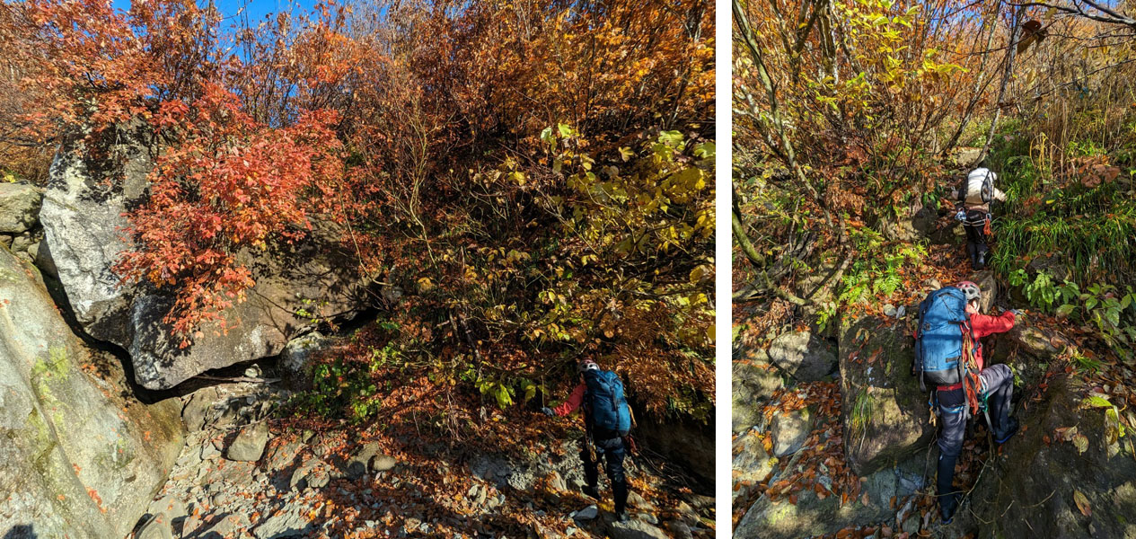 その後藪へ突入。一旦藪がなくなり、スラブを少し登りまたすぐに藪。厄介な藪、低い藪と繰り返し、休憩をはさみつつ進むと、正面大岩で塞がれる。