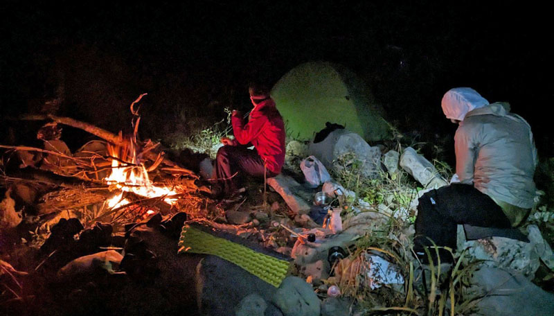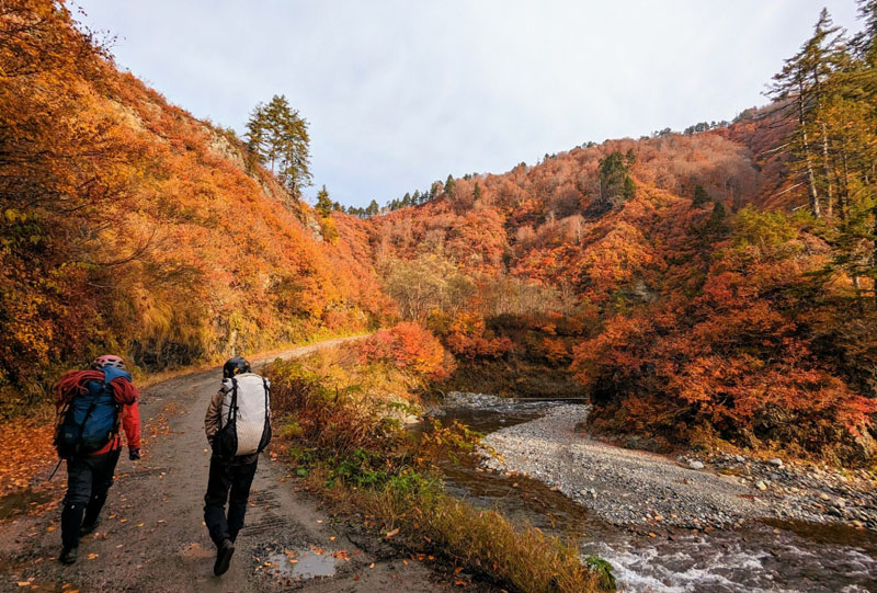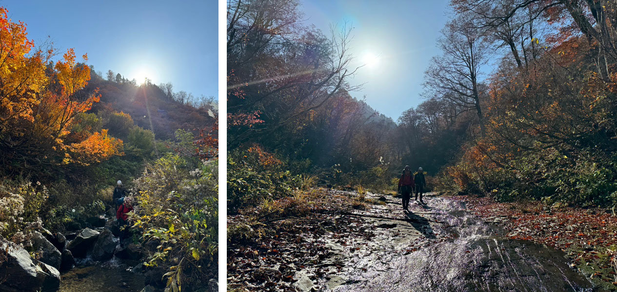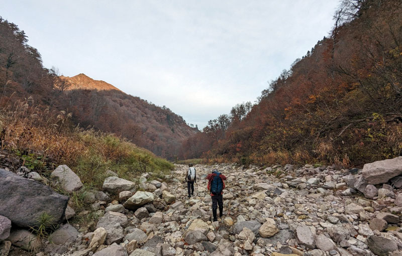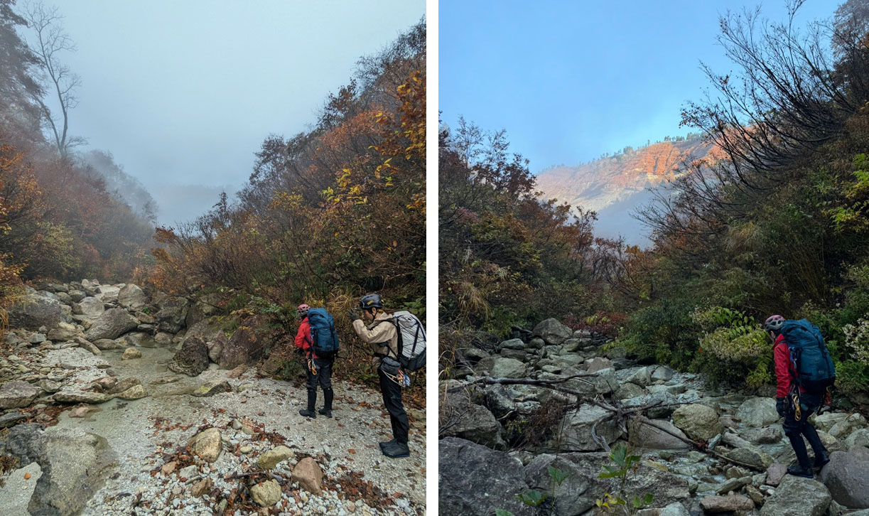 今日は2時間半ほどの行程のため、時間にも気持ちにも余裕がある。朝の冷え込みもなく、ゆったりと焚火前で朝食を取った後、出発。