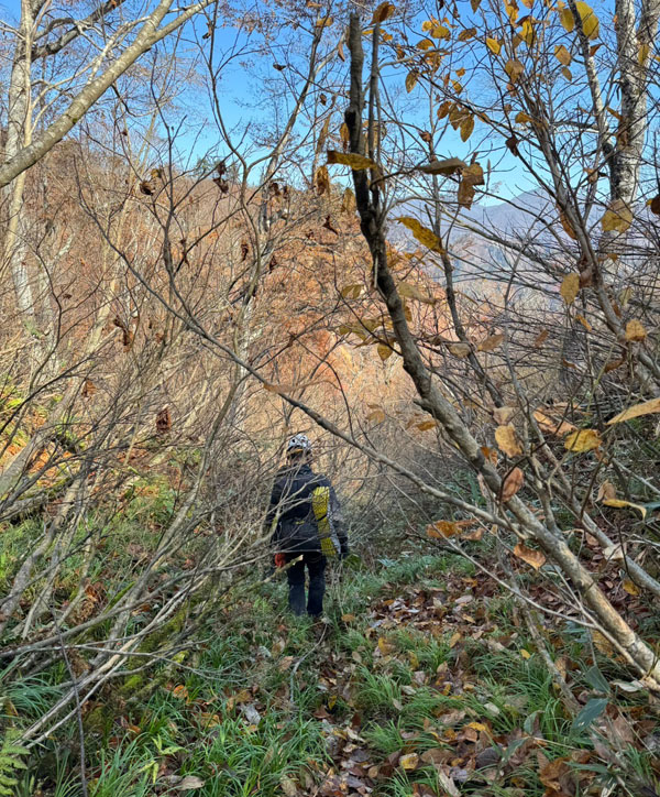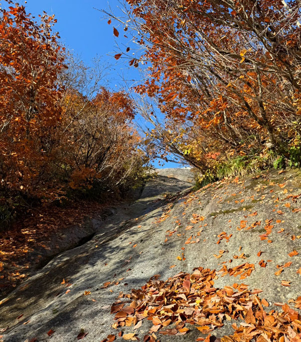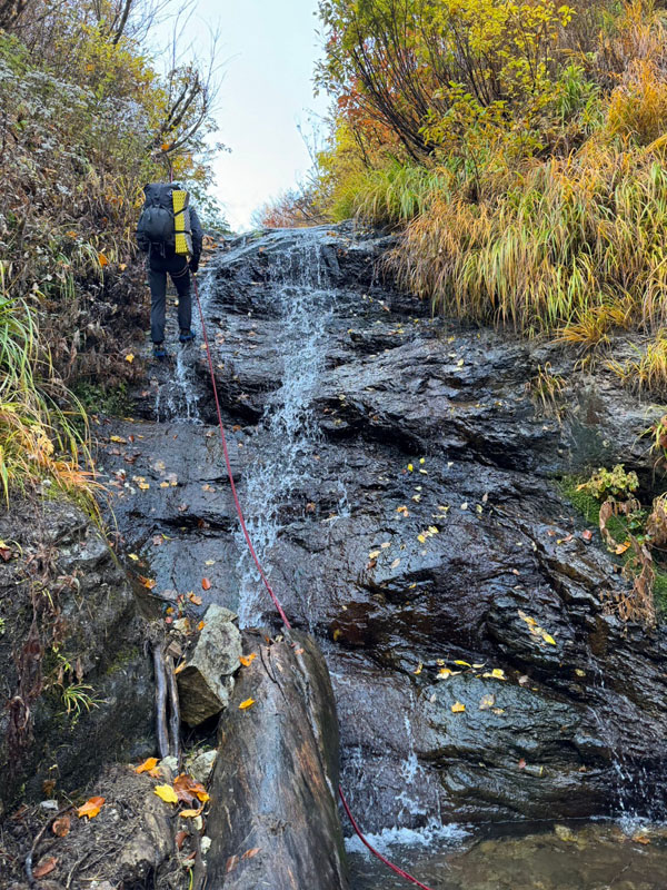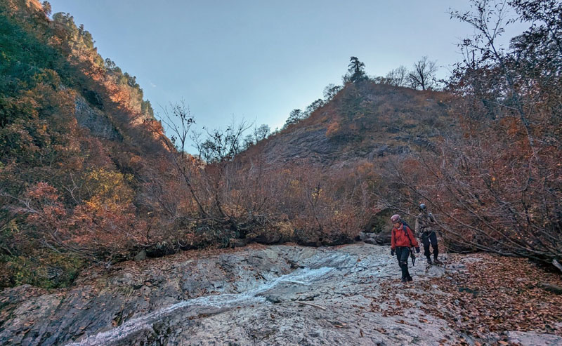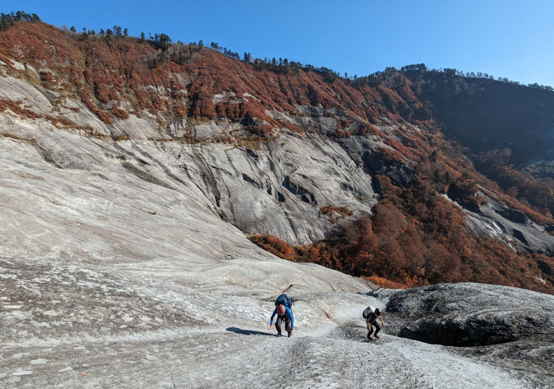 スラブの取付きに到着。取付きから数メートルは傾斜が強く、濡れている上に落ち葉も多くて、非常に滑る。この数メートルが核心だった。研究すべく三者三様のシューズをセレクトしたが、ここはラバーソールが優秀。クライミングシューズ、チェーンアイゼンは、この先傾斜が緩くなったところで装着するのが良い。