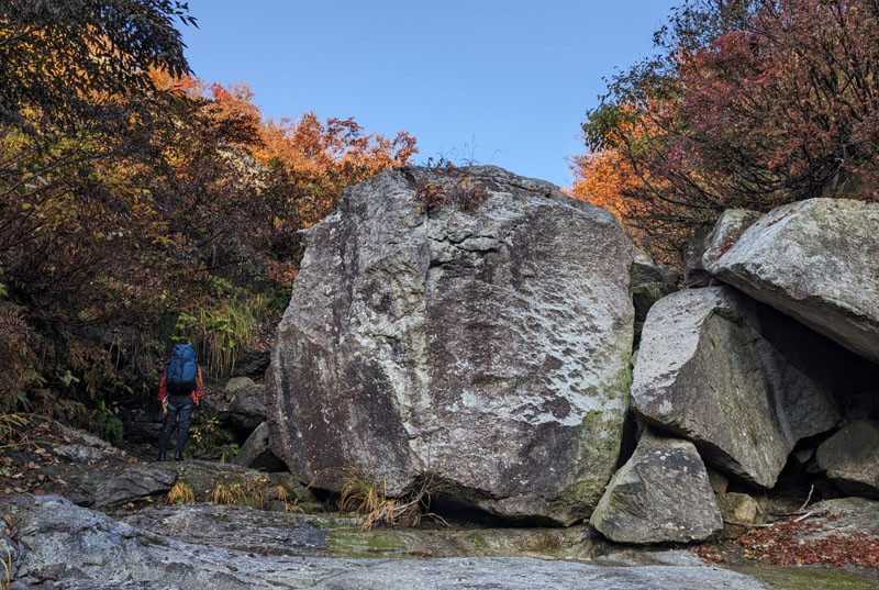 正面大岩で塞がれた箇所は、手前に数メートル戻ると右側藪に明瞭な巻道あり。巻道は行きすぎ注意。沢が見えたらすぐに戻る。