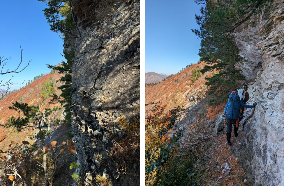 左側の踏み跡へ進むと左斜面も大きなスラブ。崩れているので慎重に進む。