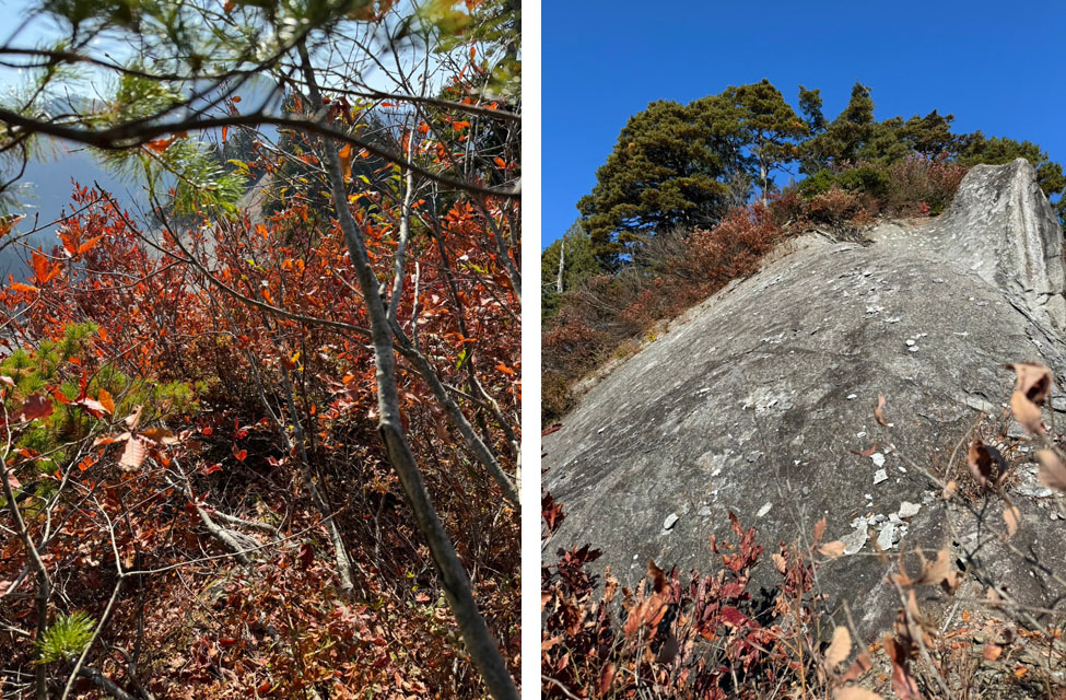 岩がなくなり右上稜線へ這い上がる箇所が急斜面でかなり悪い。稜線へ戻り90m登って1190mのコル。