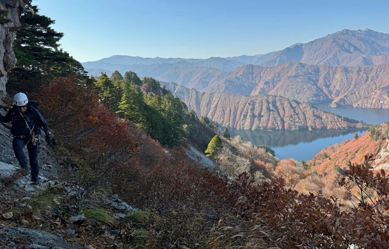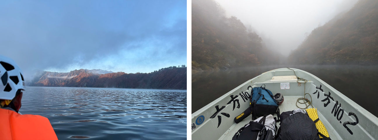 11/3 奥只見遊覧船乗り場6:50→(六方ボート)→白石沢出合(入渓)7:25~スラブ取り付き8:10~(1時間ほどスラブ満喫)~馬の背9:30~1190mコル(岩穴沢下降点)11:20~南沢出合(幕営)14:50