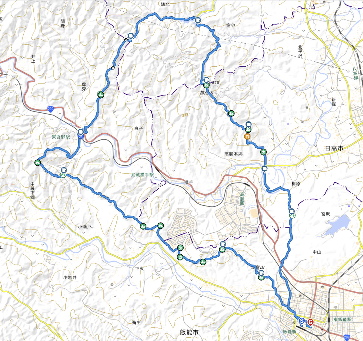 飯能駅7:00~天覧山7:25~天峯主山7:50~久須美山8:50~天覚山10:15~東吾野駅10:45~橋本山11:45~鎌北湖12:50~物見山13:55~日和田山14:30~巾着田15:15~高麗峠15:35~飯能駅16:30