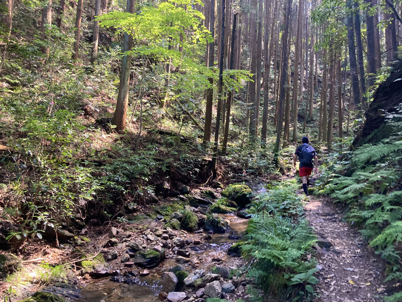 登りで耐えて、下りで走ってその勢い(惰性)で次の登りの途中まで進むというのを繰り返す。平地になったときにストライドを伸ばすとさらに足が進む。少し先に目線をやって、気の根っこや段差に合わせて細かくステップを切り替えていく。結構おもしろい、これがトレランか!