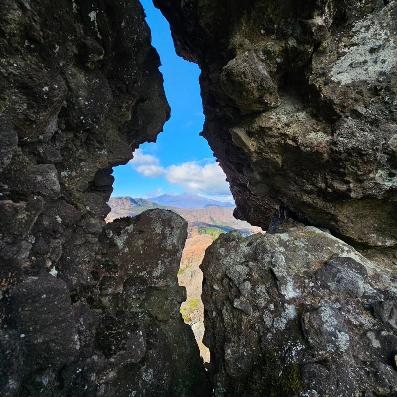 雌岩はP2で若干のクライミング。雄岩、雌岩ともに手がかりが多く登れますが、一人という緊張感でヒリヒリしました。有名(?)な雌岩のポイント。浅間山が綺麗です。