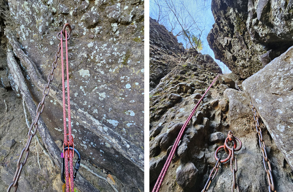 下りはせっかくなので懸垂下降で。50mロープ1本では一度に降りる長さがないので、途中のテラスで再度懸垂。