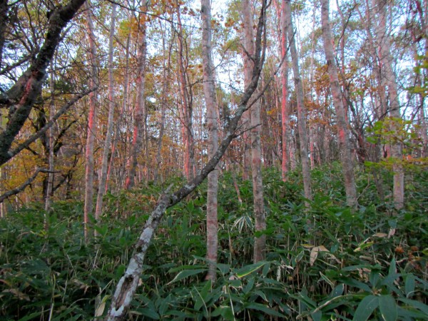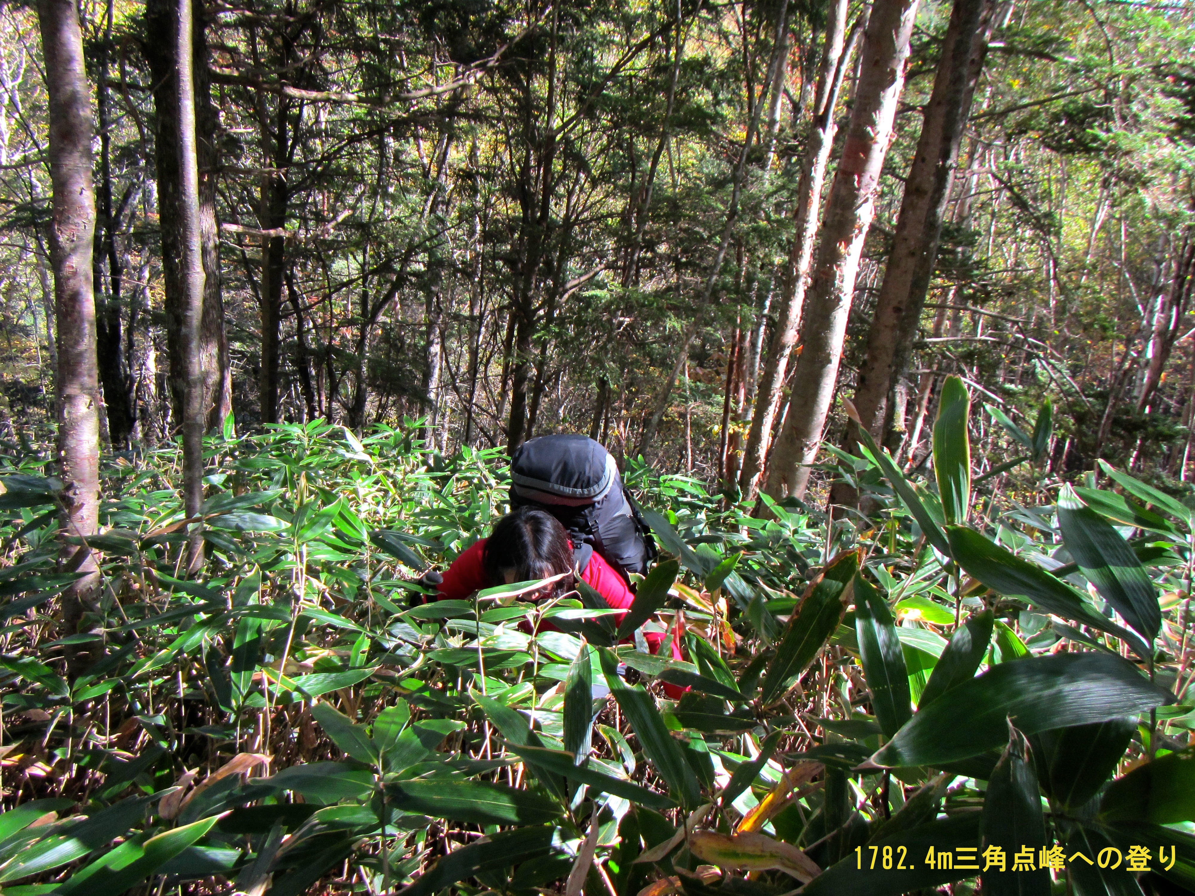 10/13 6時出発。昨日のテント場は選択は絶好であった。朝から藪漕ぎである。あまりテント泊に適した場所はなかった。樹林の薄いところはヤブがうるさい。それでも、この程度なら問題にならない。地形図で判断する限り、1823m標高点〜1851m標高点の間に今日のテント場を予定する。今日中に坊主岳まで行ければ最高だけれど、それはちょっと無理がありそう。