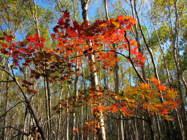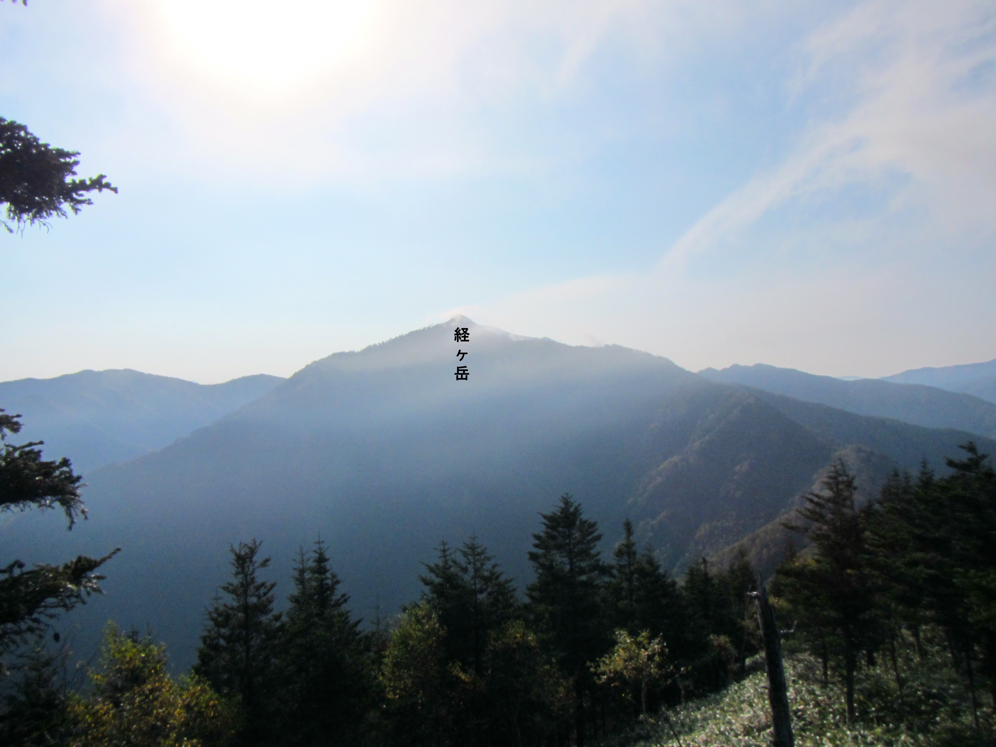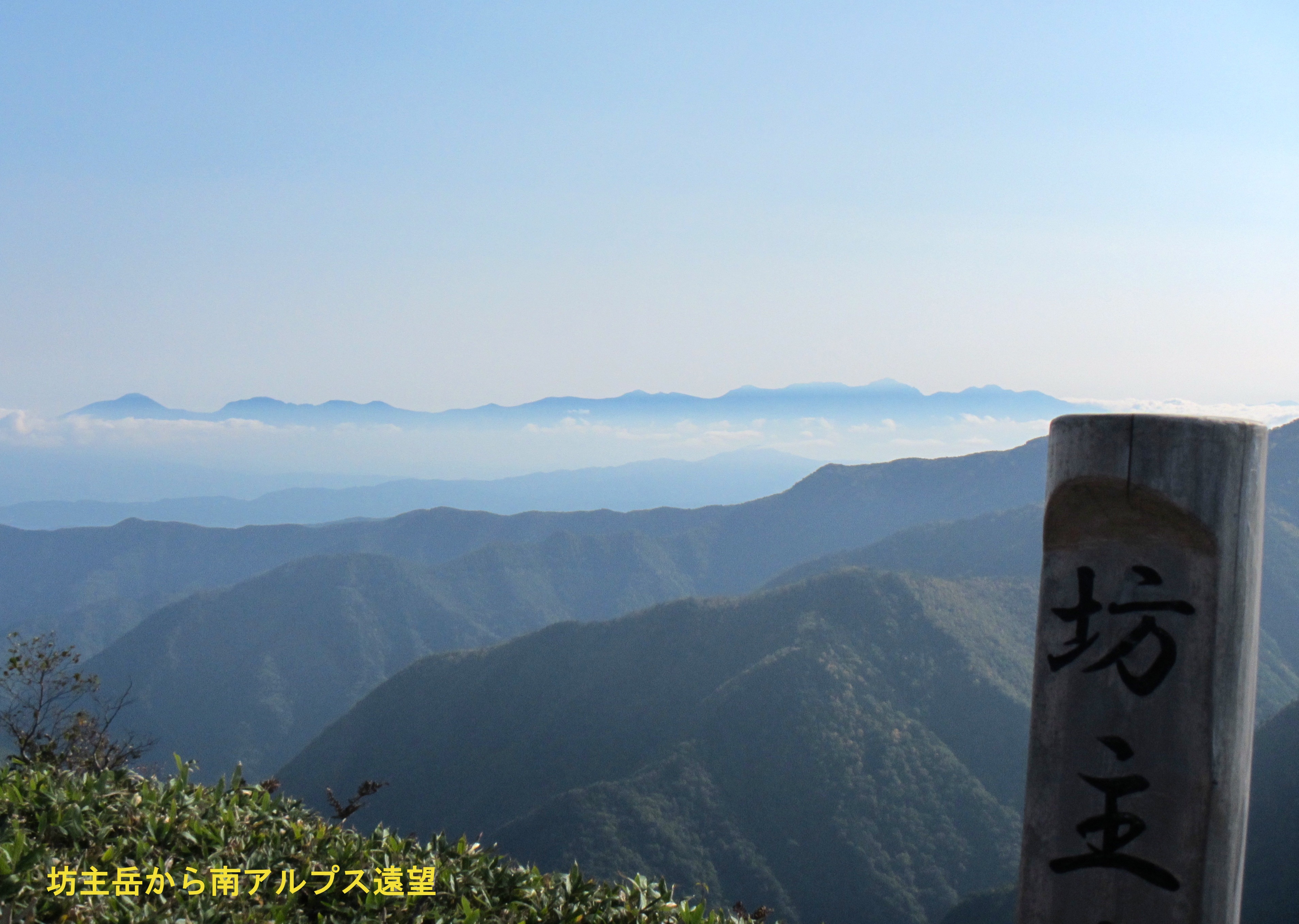 10/14 今日は朝から藪漕ぎである。それでも踏跡は辿れる程度の初級クラスである。出発して40分足らずで1851m標高点である。順調です。いったん下って薮の中の踏跡を探すように登り返すとひょっこり薮から飛び出すとそこは1961m標高点峰。そこからはしっかりと刈り払いがされている。どうやらここから坊主岳までは刈り払いがされているようだ。あとは天国のような尾根道を坊主岳へ歩を進めるだけである。この夏歩いた経ヶ岳や、はるか御岳山、乗鞍岳の展望を楽しみながら、フィナーレである。