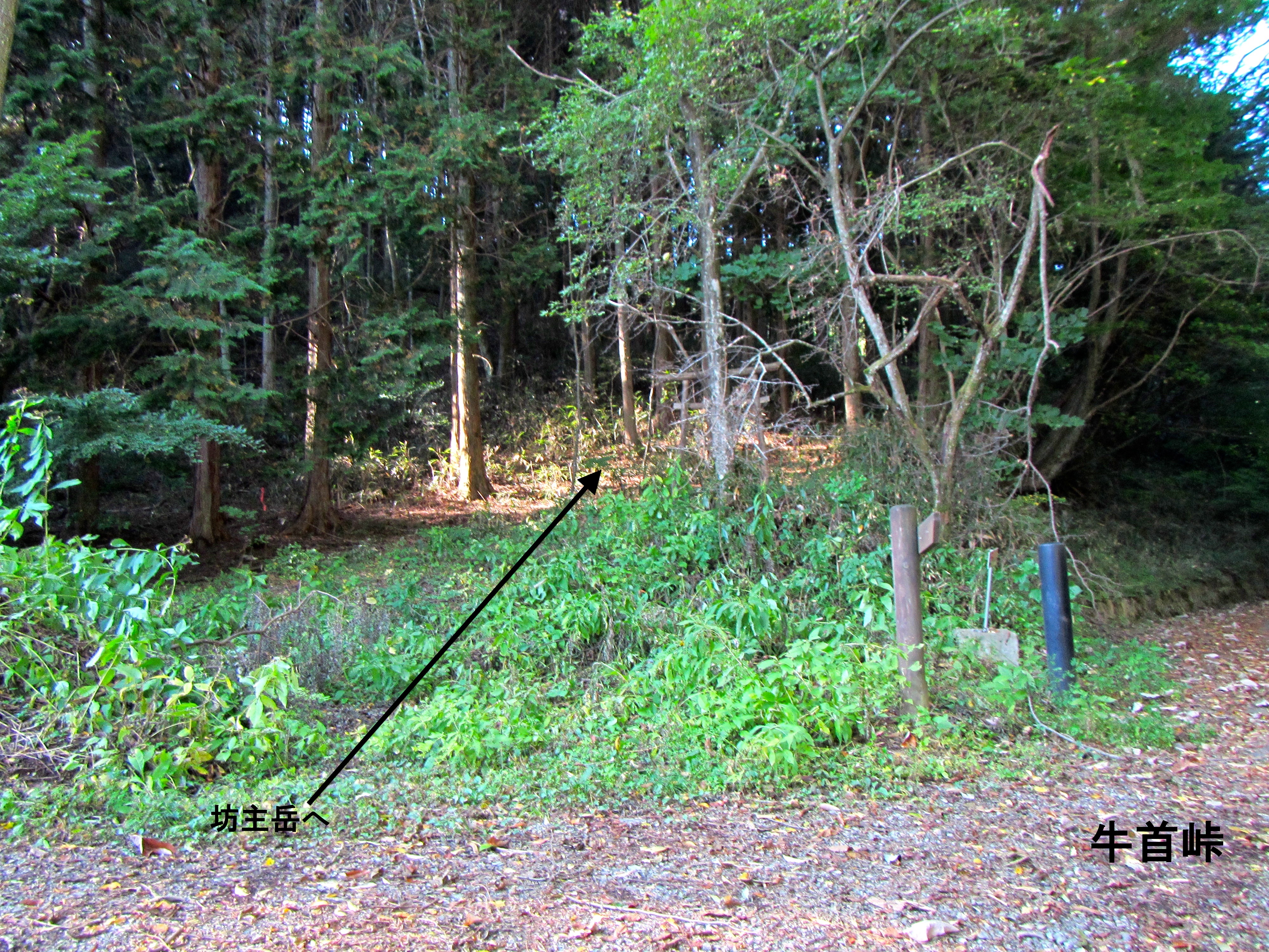 ヤブを覚悟していたが、古い踏跡が尾根沿いに上に延びている。ラッキーである。稜線まで登ればそれ程の急登はない。1347mの標高点はパスして、牛首峠から延びている林道の終点のコルに向う。コルには丸太の柵が林道のゲートとなっている。ここからは境界線なので所々、見出し標が出て来る。ヤブが深いところもあるが、全体としてはヤブは薄い。踏跡もとぎれとぎれだが続いている。7月、8月の坊主岳から権兵衛峠間のような激しいヤブは出てこない。