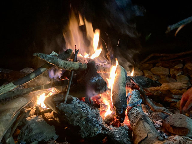 温泉のおかげで暖かく、寒さは全く感じない。乾いた薪はよく燃え、翌日のお酒の残りを気にしながら宴会し、21時くらいに就寝。