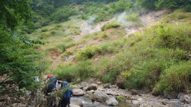 4時起床。暖かくよく眠れた。濡れた沢装備の装着も冷たさを感じない。6時に予定通り出発。湯煙が上がる温泉地を後にした。