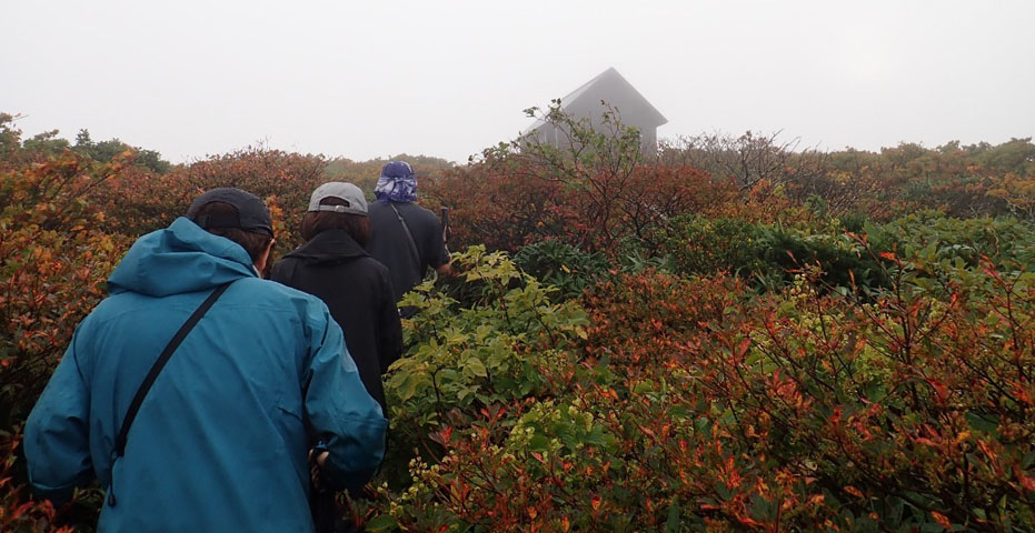 1時間も経たずに避難小屋のある山頂に着いた。ガスっている。記念写真を撮影し、湿原の中、木道を歩いてみる。天気に恵まれれば眺めの良いところだ。引き返して小屋の中を見ると、2階もあって10人以上は入れそうだった。