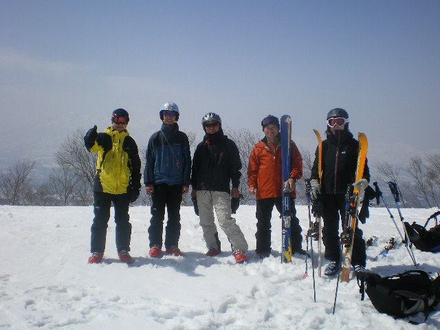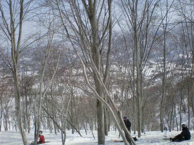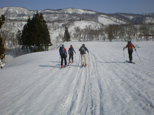 大休止して、シールを剥がし、ピシっと滑降装備を整えて、さあ、ツリーラン!気温も上がり、尾根上の雪はべったりと緩んで重かったが、各自思い思いのトレースを取りながら、北側の尾根緩斜面をしばらく樹間を縫いながら下降。所々、斜度が強まるが、ツリーランで滑るとあっという間に高度が下がっていく。もったいないな~、と途中ゆっくり休憩して、春の雪のブナ林の雰囲気を堪能しました。尾根から、I氏の選択した良さそうな中斜面で、下の広い斜面へ滑降。雪団子が落ちるけれど、湿雪で安定した重雪。その後、緩々と直滑降や小沢を越えるアップダウンを交えて、あっという間に田茂木池西側の小屋に。