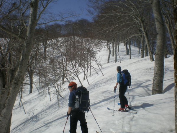北側の尾根に取りついてからは、しばらく急登をキックターンしながら登る。尾根に上がると、斜度が緩み、南側の尾根との間のブナの林(とってもいい雰囲気です!)を愛でながら、尾根を頂上へ向けて登って行きます。頂上は、無木立で360度の展望。のびやかな信越国境稜線の眺めは素敵でした。