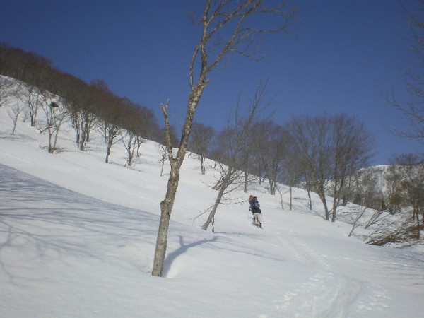鍋倉山からは東方向に二つの尾根が派生しているが、奥の北側の尾根を回り込みながらじわじわ高度を上げていく。途中、北側尾根から滑走に楽しそうな斜面を、物色しつつ~。