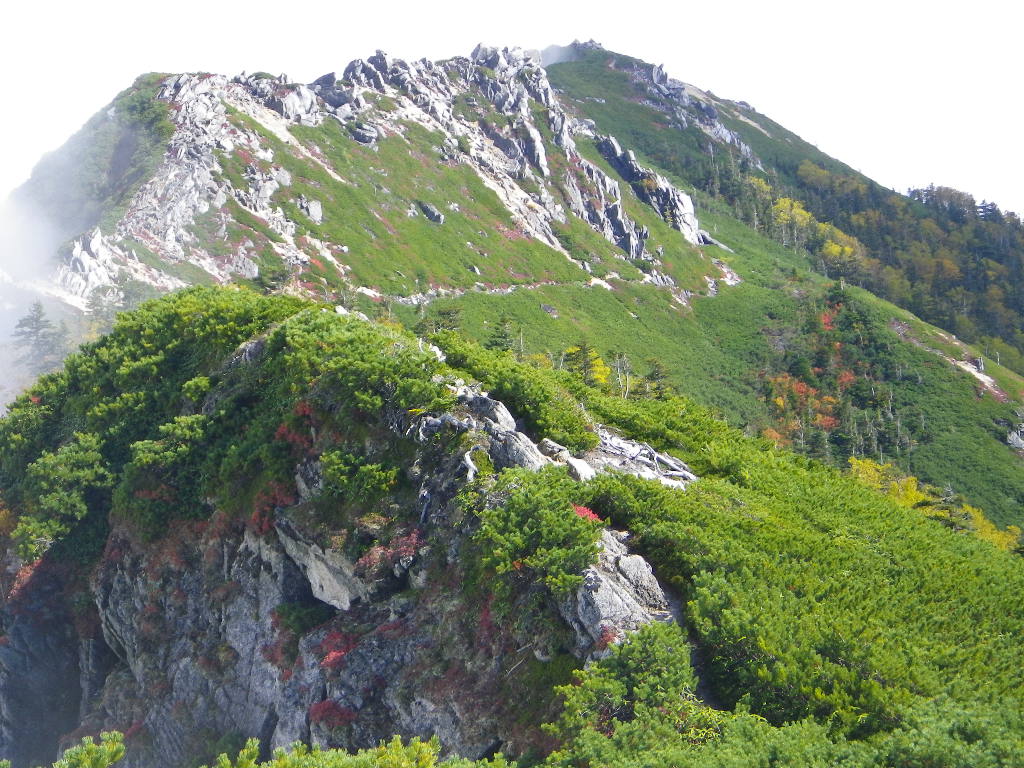 重い腰を上げ、唐沢岳山頂から往路を戻る。快晴の空も、午前も遅くなると時折ガスが去来してくる。往路に下ってきた餓鬼岳稜線の山腹は、早朝より一層、紅葉が進んだ模様で、ハイマツの中の赤い群落がより鮮やかに見えた。餓鬼岳稜線までせっせと登り返して、帰路は途中から巻き道を使って小屋に戻った。帰路途中から見る餓鬼岳北西面の岩峰も、中々の景観でした。バルタン星人みたいな「チョキ」の岩峰もあったり・・。(笑)