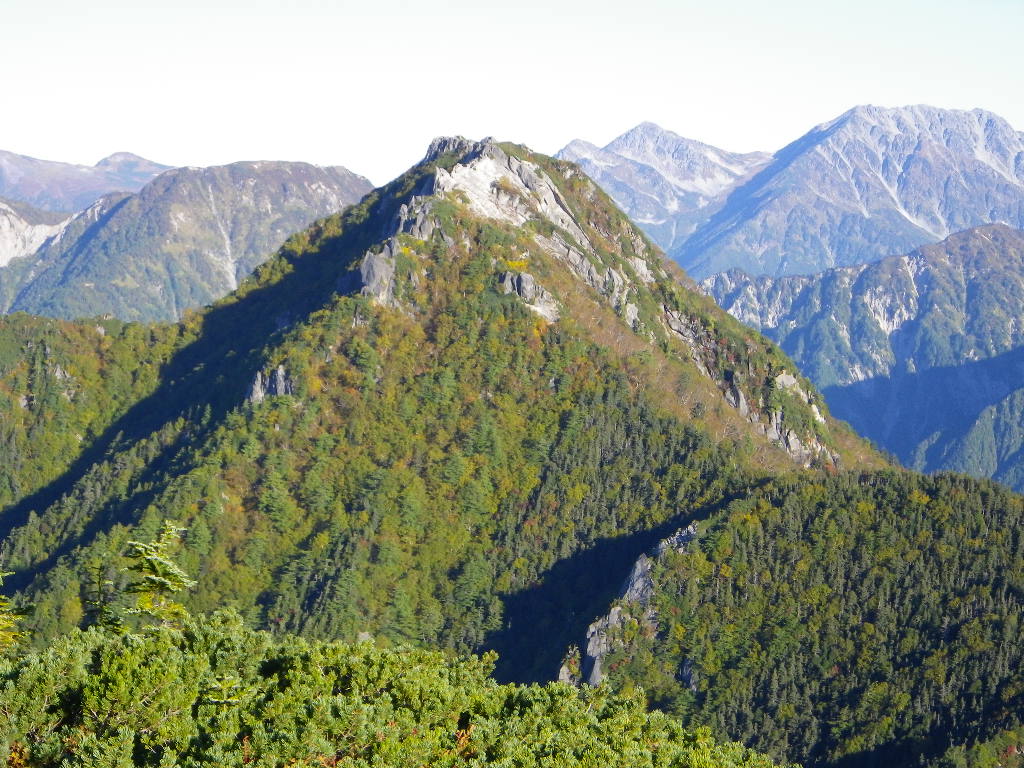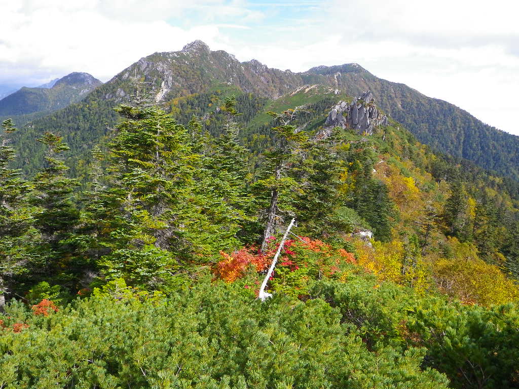 稜線上は、風も強い。「ケンズリ」の岩稜帯を過ぎ、稜線の向きが変わると、ひとしきり樹林帯の中の下降。その後、再び2508mピークまで登る。これから向かう東沢岳、そこから東餓鬼岳へと派生する稜線は紅葉が鮮やかで、しばし見とれてしまいました。もう一つ岩稜帯を過ぎて東沢岳直下へ。振り返ると、餓鬼岳からの稜線は、これも紅葉で鮮やかだった。ケンズリの岩峰群も中々の景観。東沢岳直下から東沢乗越まで、鮮やかな樹林帯の中をガンガンと下降。朝には見えていた燕岳の稜線は、すっかり雲の中になっていた。